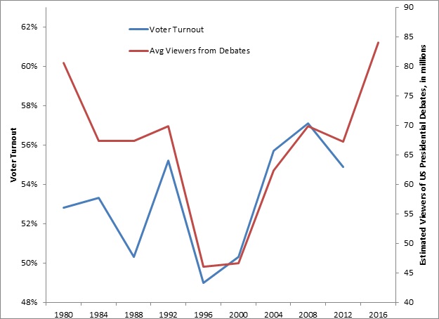 The following chart compares historical voter turnout in US Presidential Elections and US Presidential Debate viewership.