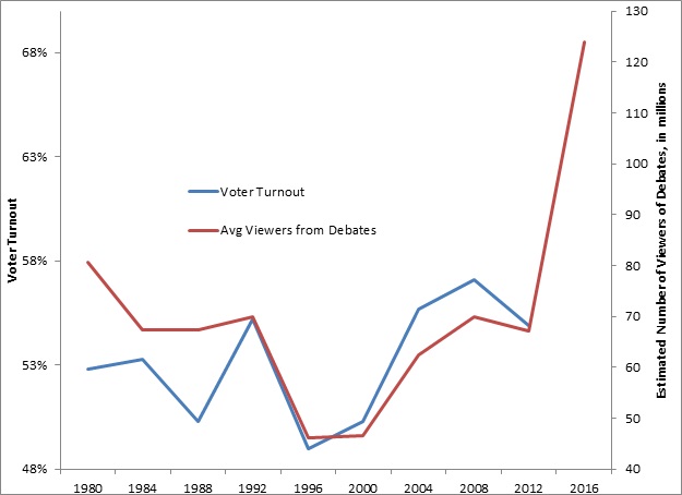 In theory, higher viewership should result in higher voter turnout.  In general, interest and enthusiasm levels are good indicators for forecasting turnout – and we can more or less assume that viewership of debates is good indicator of interest.
