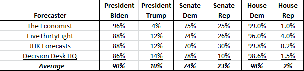 Based on a basket of forecasters, Democrats have an approximate 90% chance of winning the Presidency, 98% of maintaining control of the House, and a 74% of taking control of the Senate.