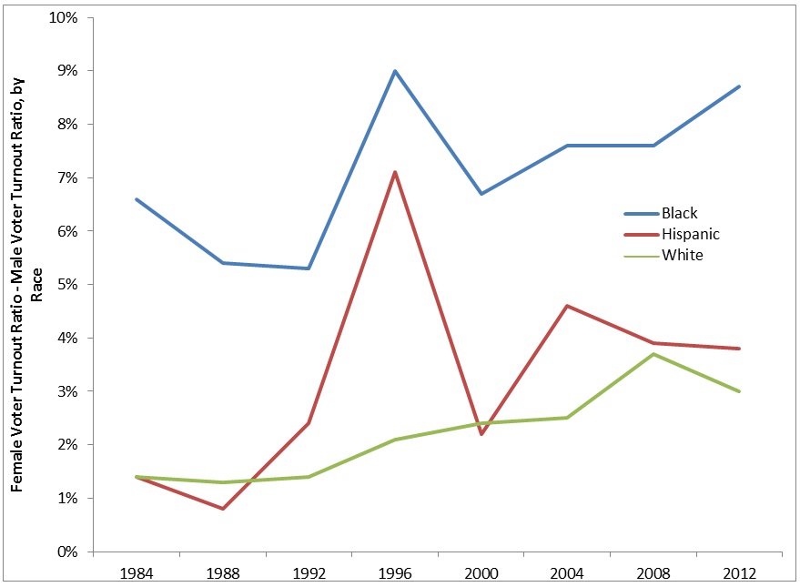 As we can see in the previous chart, women vote at higher rates than men in every major group presented. Furthermore this trend has lasted for decades. It does not look like the trend will invert all of the sudden. The real question is can voter turnout increase for women at a significantly greater rate than for men given that women are already at so much of a higher level?
