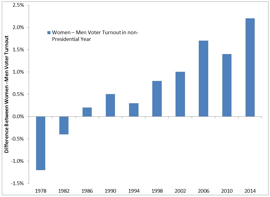 The mid-term data shows a very similar trend to that of US presidential elections. The margin between women’s and men’s voter turnout has been growing for the last few decades. It started with men having a higher turnout at a marginal difference of over 1% in favor of men. By 2014, the net difference swung to an over 2% difference in favor of women. The trend appears fairly strong over the long-term, but obviously cannot continue indefinitely. At some point it will have to stabilize or even invert.