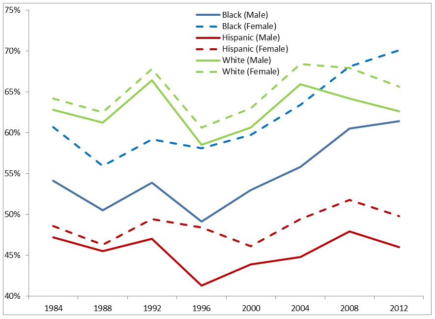 So, the next issue is gender’s impact on voter turnout. Let’s start with the long-term trend for voter turnout as broken down by gender and race.