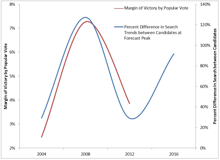 The last three presidential elections show a fairly similar pattern of search trends being able to indicate the approximate margin of victory.  There are still unknowns for the 2016 race including if Trump can maintain his lead over Clinton to the same degree.  However, if the current trends continue it would imply a Trump victory by something like 5-6% over Clinton.  This would translate into a likely Electoral College victory by over 100 electoral votes.  Such a scenario would have Trump winning all or almost all of the swing states and many of the rust belt states.  Given current polls this is an extremely out-of-consensus call.