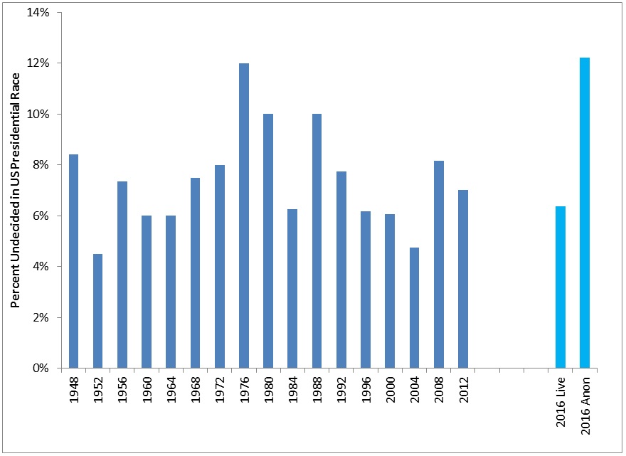 So, it really depends on if you chose to use live or anonymous poll data. Using live poll data, 2016 looks like it has fewer undecideds than average while using the anonymous data it is slightly above the all-time high.