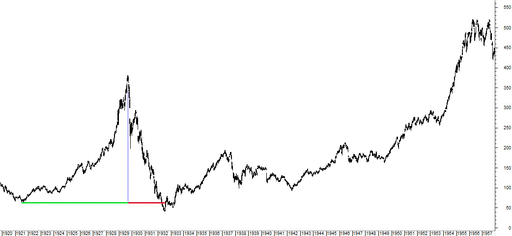 Dow Jones Industrail Average, 1919 to 1957, green line highlights bubble’s appreciation stage while the red line highlights the bubble’s depreciation stage, the remainder of the chart shows the asset’s return to its previous bubble high decades later Source: Federal Reserve Bank and ZettaCap