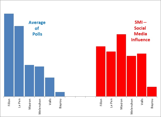 Chart 1:  2017 French Presidential Election, Comparing Current Polls to Social Media Influence (SMI) Index Ratings