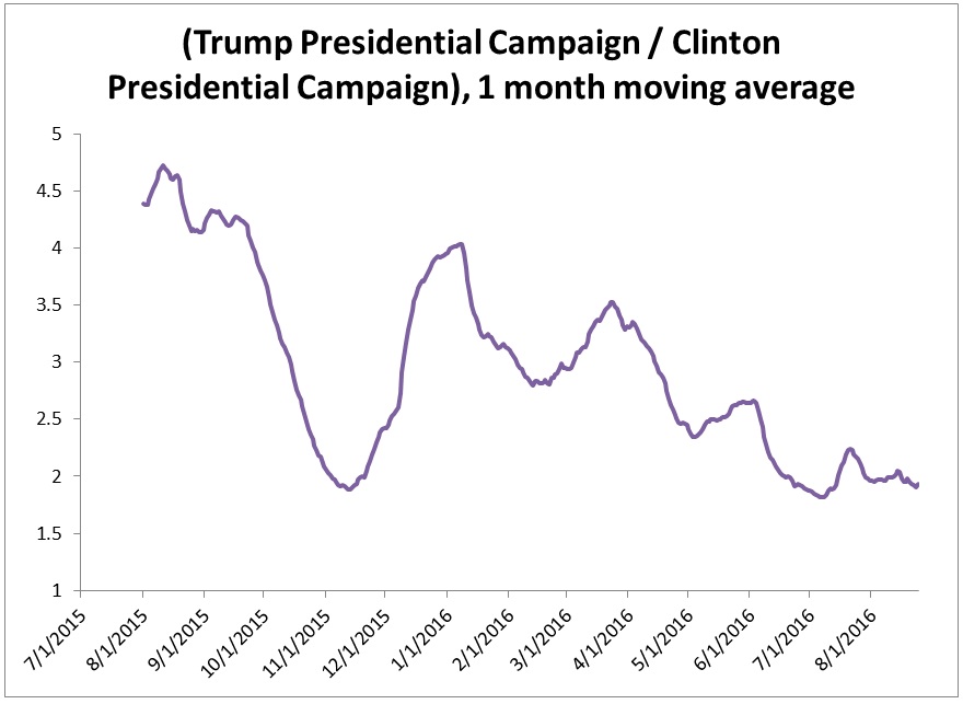 Similar to the page views of the candidates as individuals, the page views for the Trump’s campaign well exceed those for Clinton.  Even though it has fallen more recently, it has fallen to a level of around 2.0.  In other words roughly twice as many people are visiting the Trump Campaign Wikipedia page than those visiting the equivalent for Clinton.
