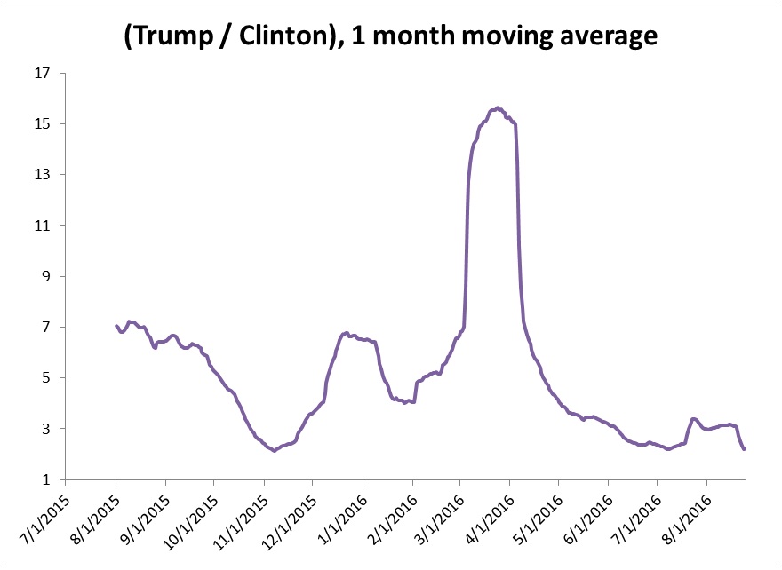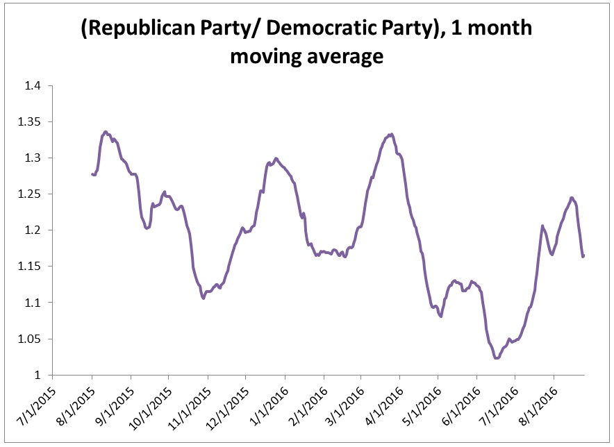 First, let’s look at how the candidates compare head-on, or comparing the page views for Donald Trump and Hillary Clinton.  This shows the page views for Donald Trump divided by those for Hillary Clinton.  A level of 1.0 is parity, anything over that shows strength for Trump.