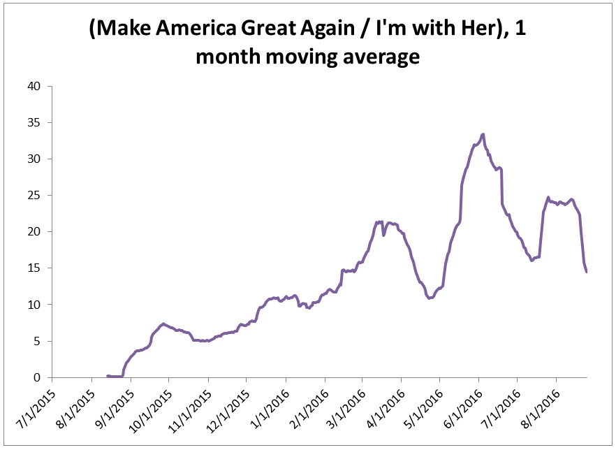 Chart 3:  Wikipedia Page Views for “Make America Great Again” / “I’m with Her”, 1 month moving average